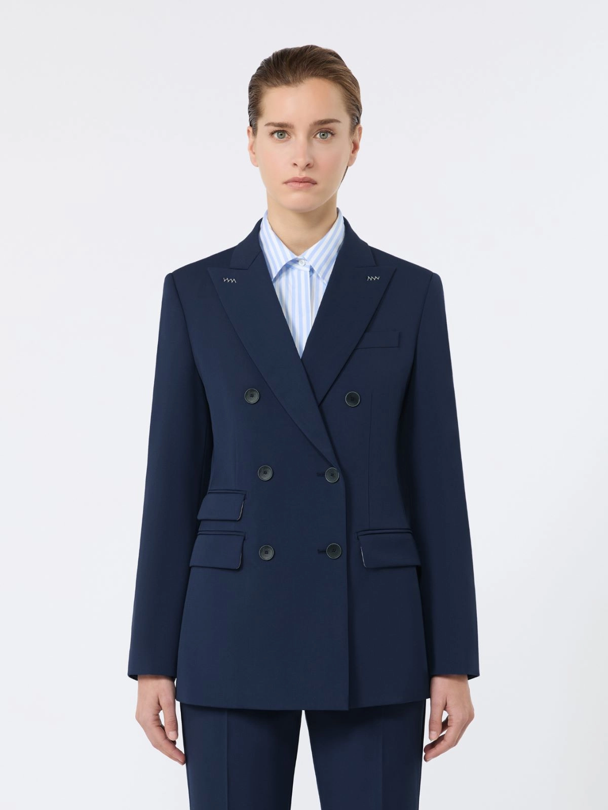 Double-breasted blazer with a modern performance, crease-resistant properties and a semi-matte surface that bestows a rich yet essential allure to the colours.