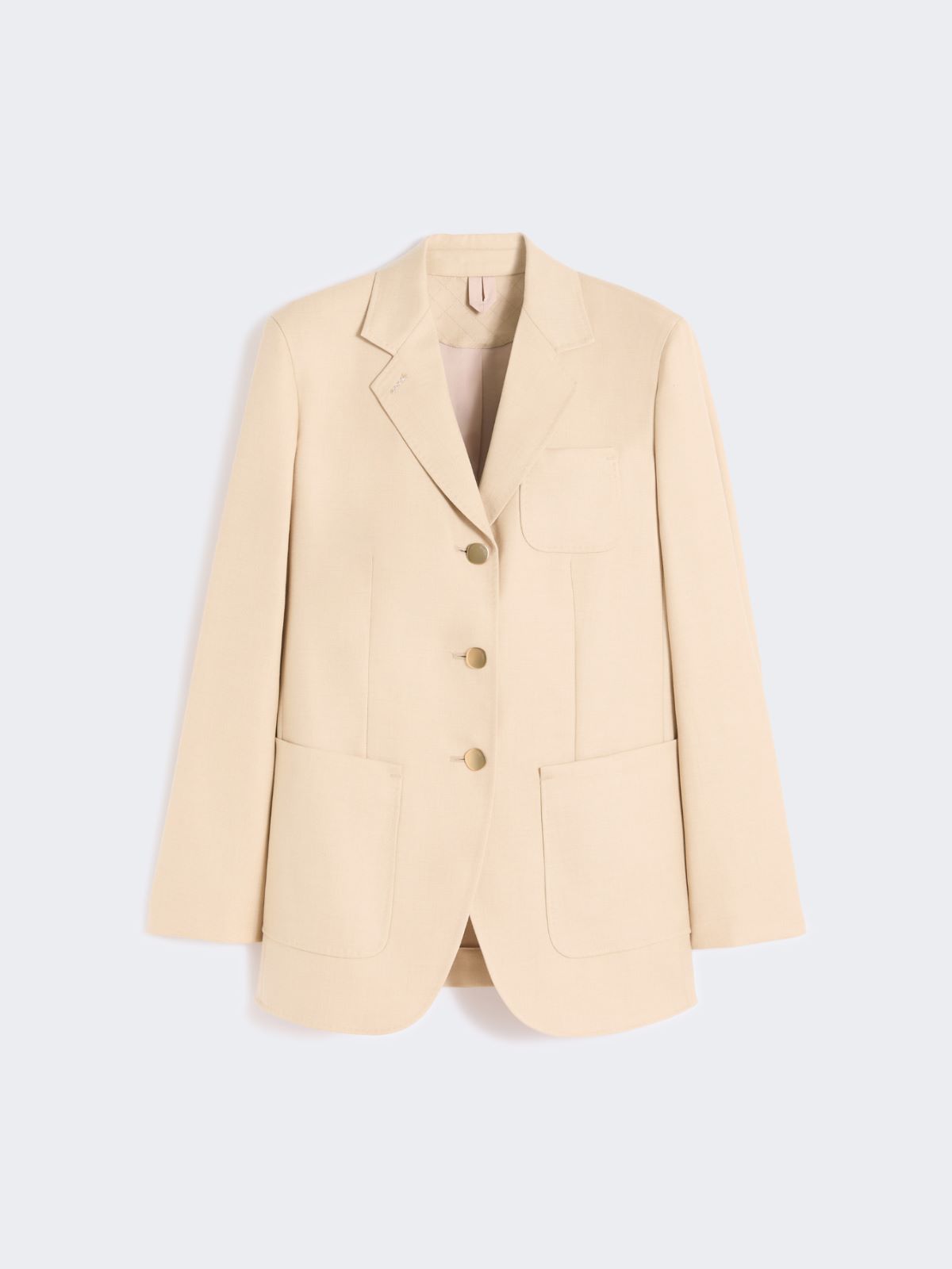 Single-breasted blazer with distinctive deep natural hues that enhance the light yet structured texture.