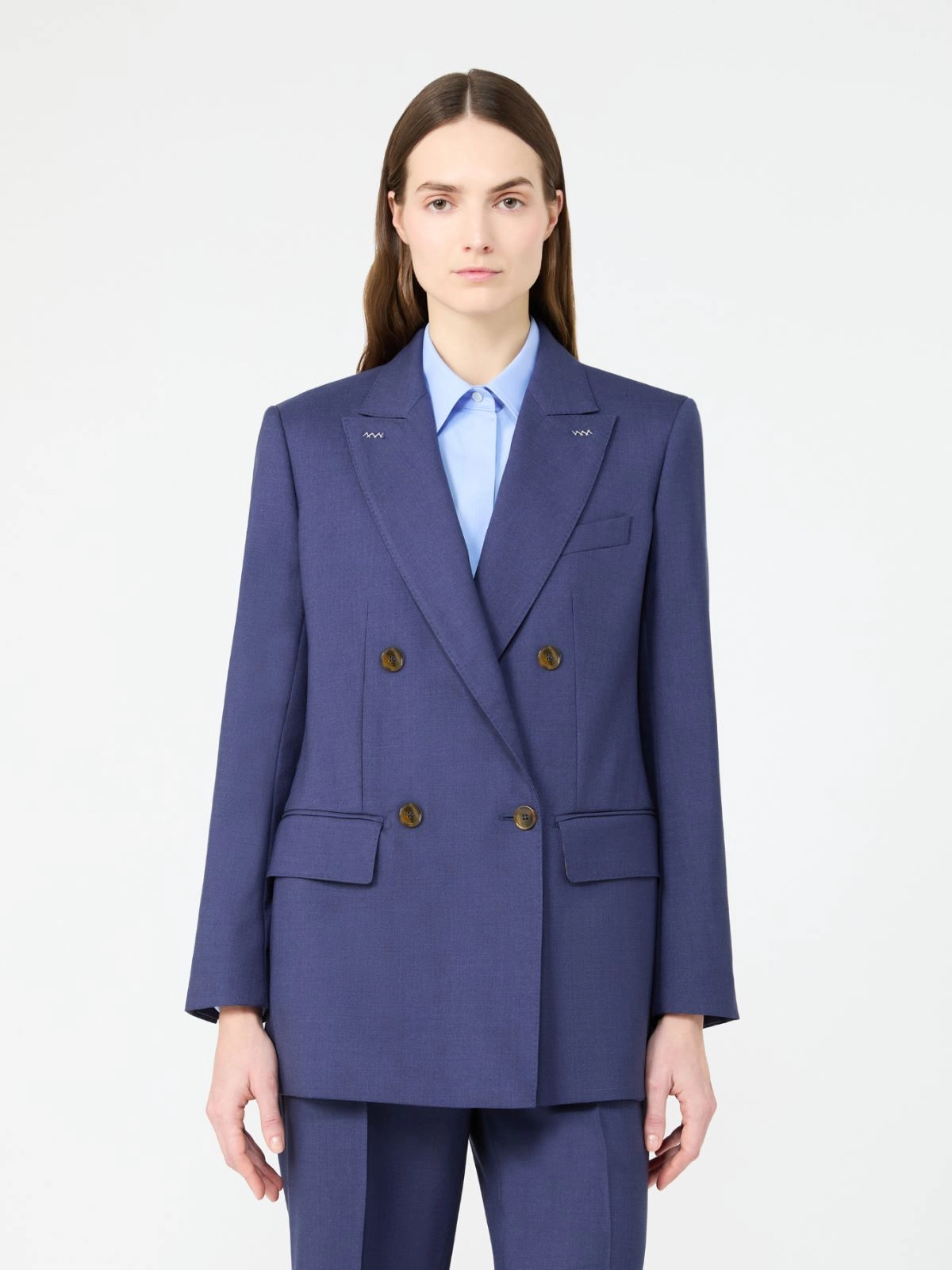 Double-breasted blazer with a slightly fitted silhouette and darts at the waist.