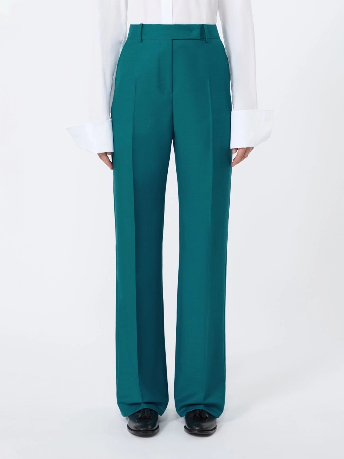Tailor-inspired trousers, characterised by a compact texture and crisp feel, recalling the vibrant freshness of denim, reinterpreted.