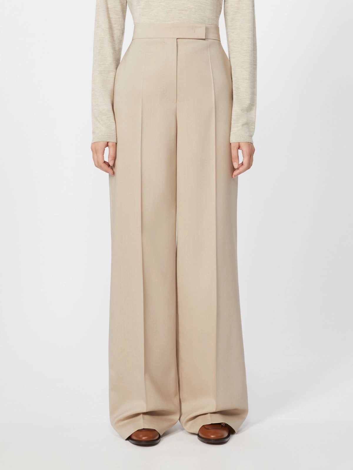 Long trousers with a distinctive wide-leg cut and pressed pleat detail.