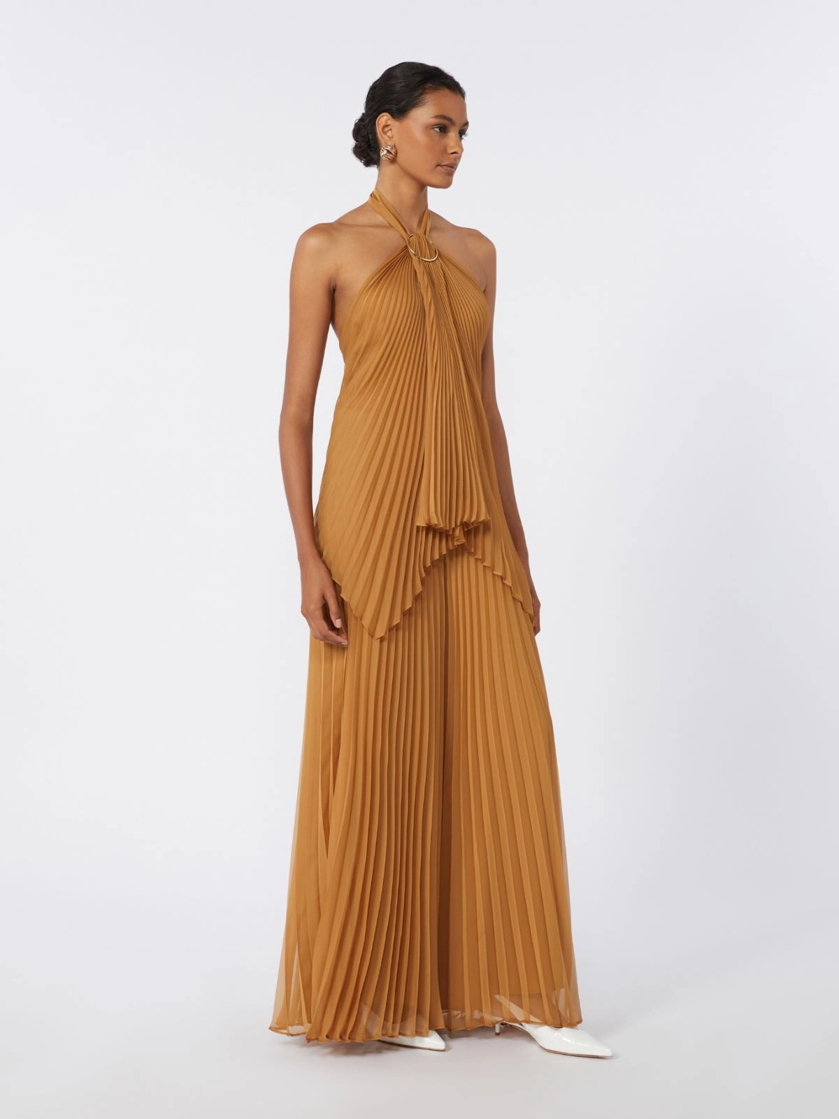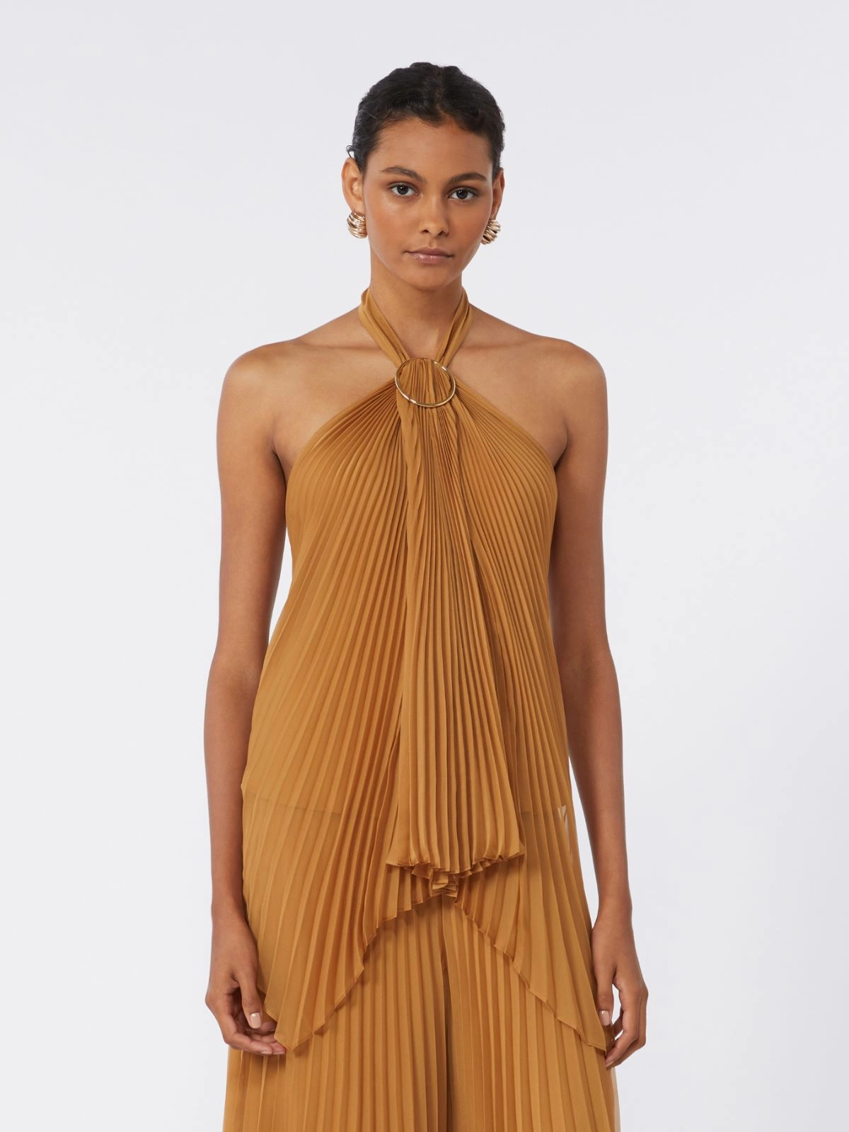- Halter neck with metal hoop brooch at the front