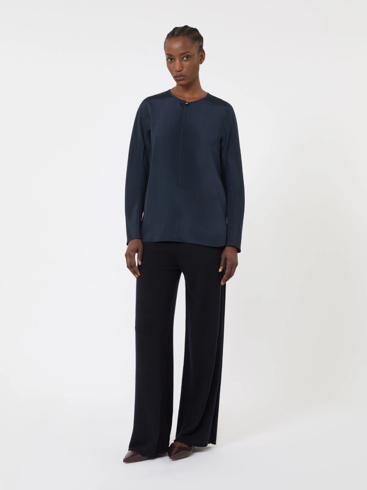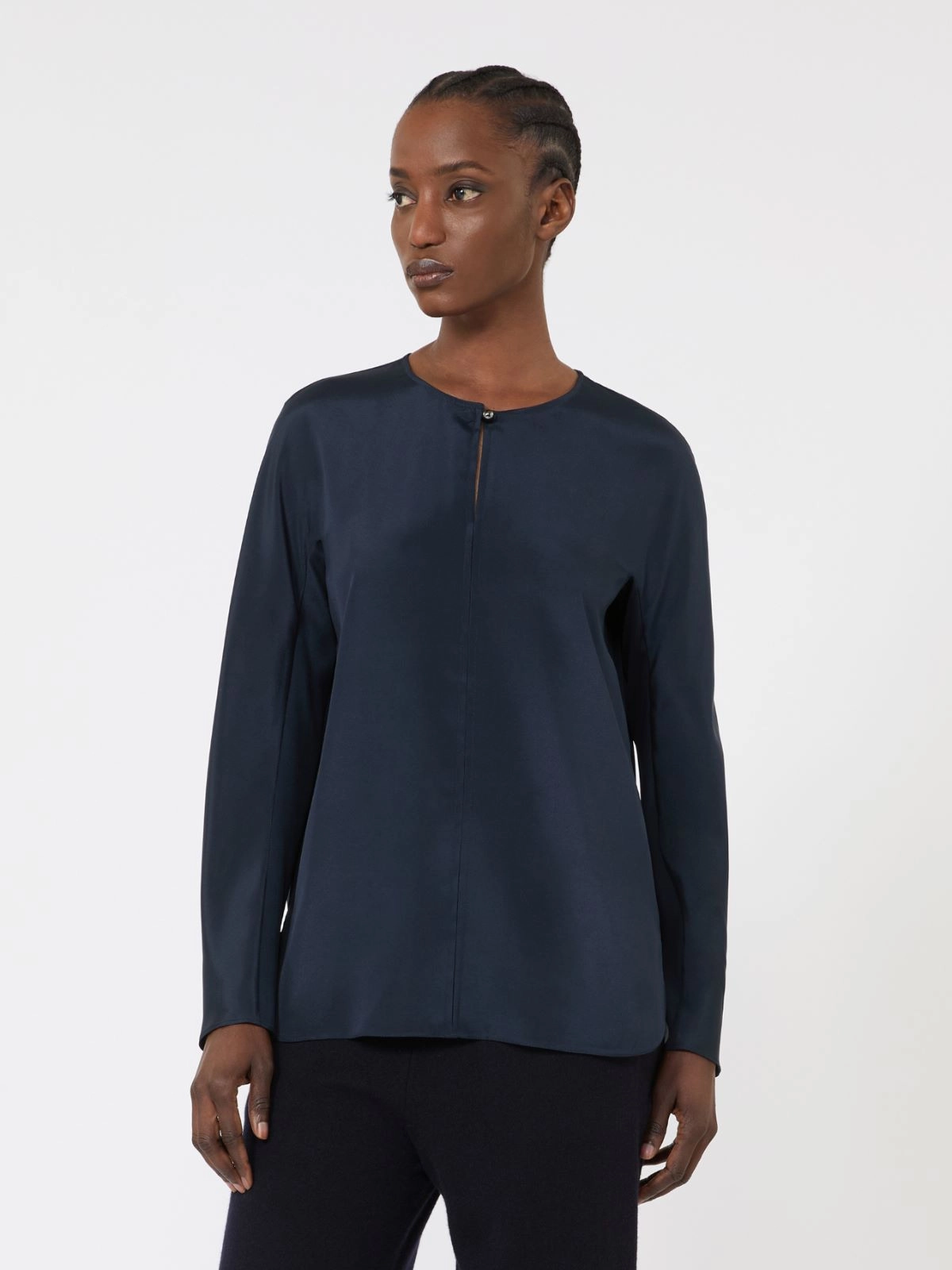 Crew-neck blouse with teardrop pattern on the neckline, fastened with a gold-coloured metal ball button.