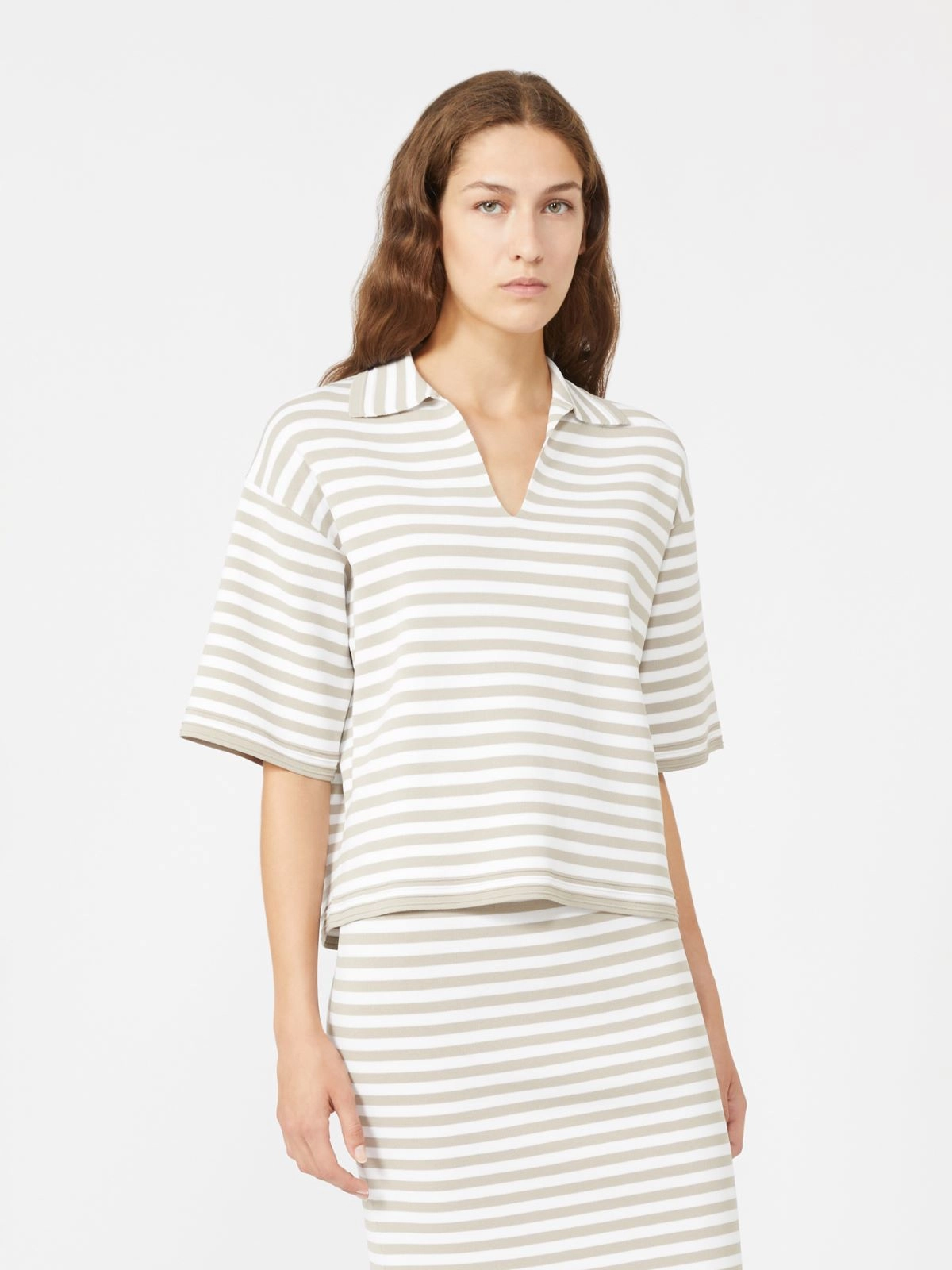 Jumper with polo-style collar and open V-neck on the front.