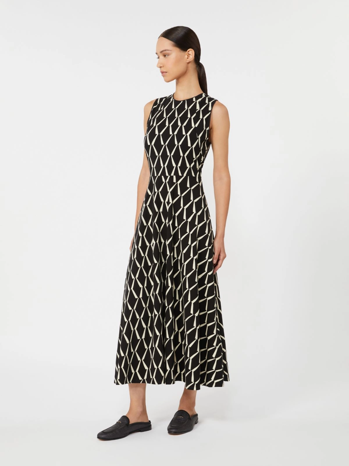Long sleeveless dress with a distinctive fit-and-flare cut.