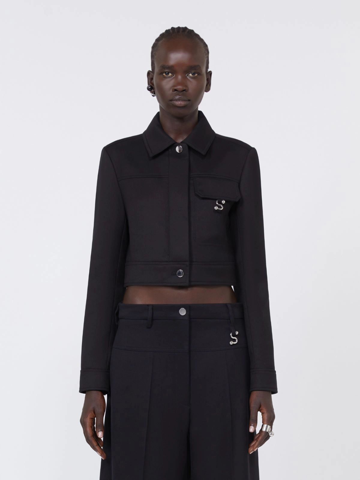 This short, washed gabardine boxy jacket boasts utility inspiration: the lines are straight over the bust, with hidden buttoning and a large pocket on the left emphasised by the visible double stitching motif. Removable S-shaped metal accessory inserted on the flap. Shirt cuffs with customised metal button.