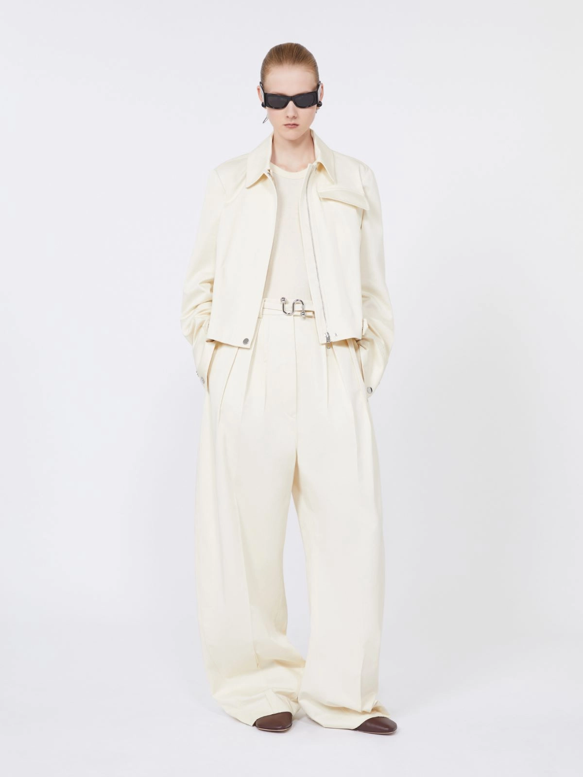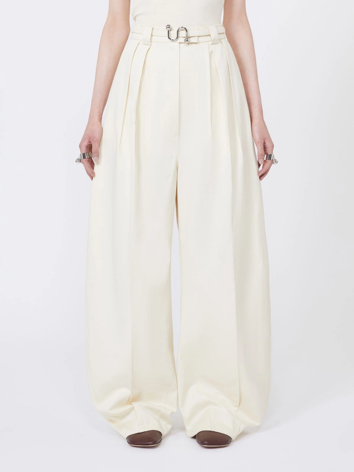Cotton gabardine trousers with a fitted waist defined by a belt and double pleats, with legs that widen to an oversized volume that tapers at the hem through shaped seams and darts at the ankle. The continuous inner waistband and pockets are mannish tailored model-inspired details.