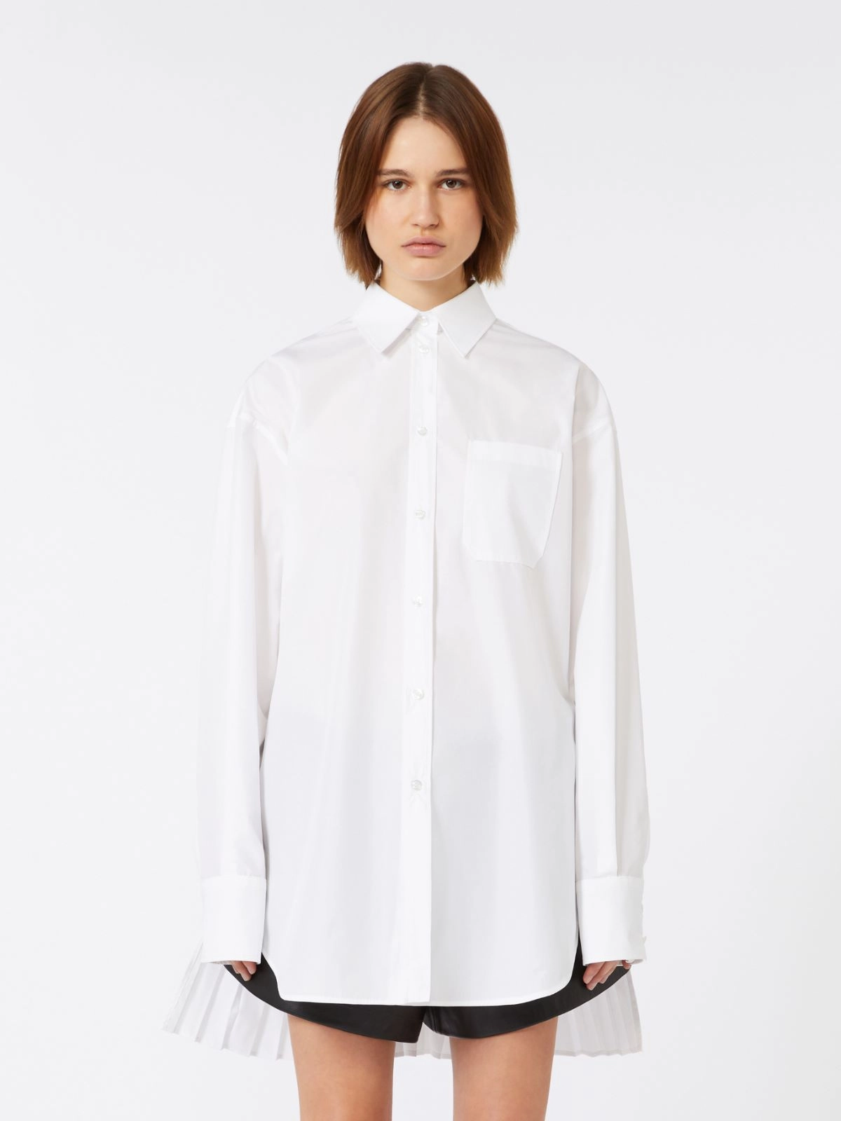 Overshirt in cotton-blend canvas, featuring menswear-inspired lines and a breast pocket. The back is crafted with pleats, with a removable metal chain attached to the sides.