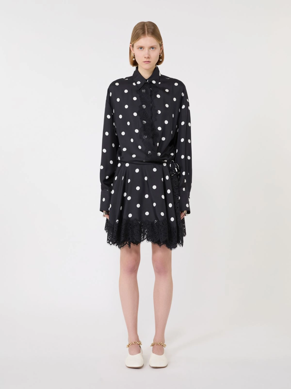 Short silk twill shirt dress with polka dot print, an oversized cut for the bodice and a reverse pleat on the back for a bloused volume and masculine allure. The neckline fastening is trimmed with lace that creates a contrasting texture on the edge of the wrap-around skirt with side tie.
