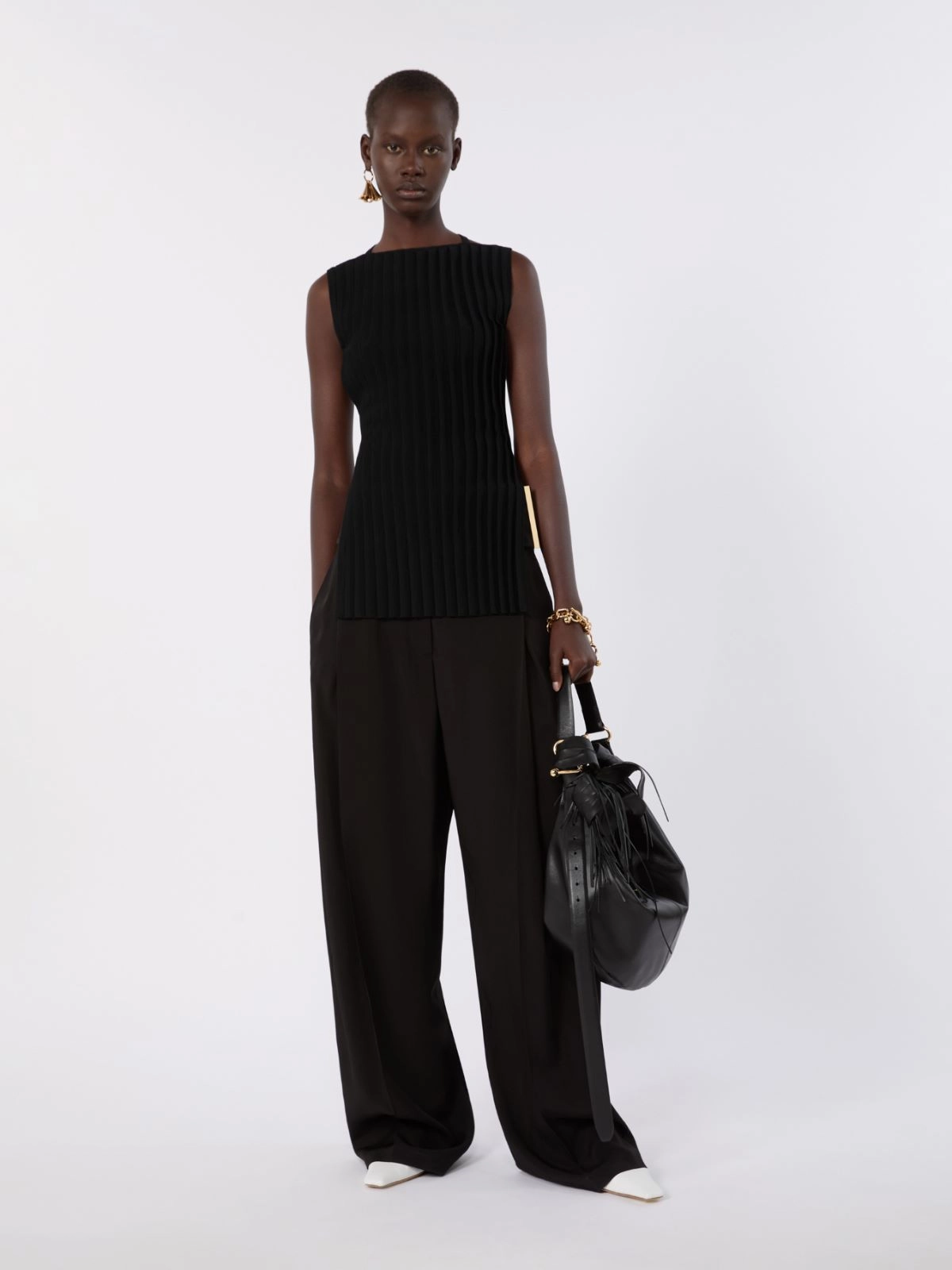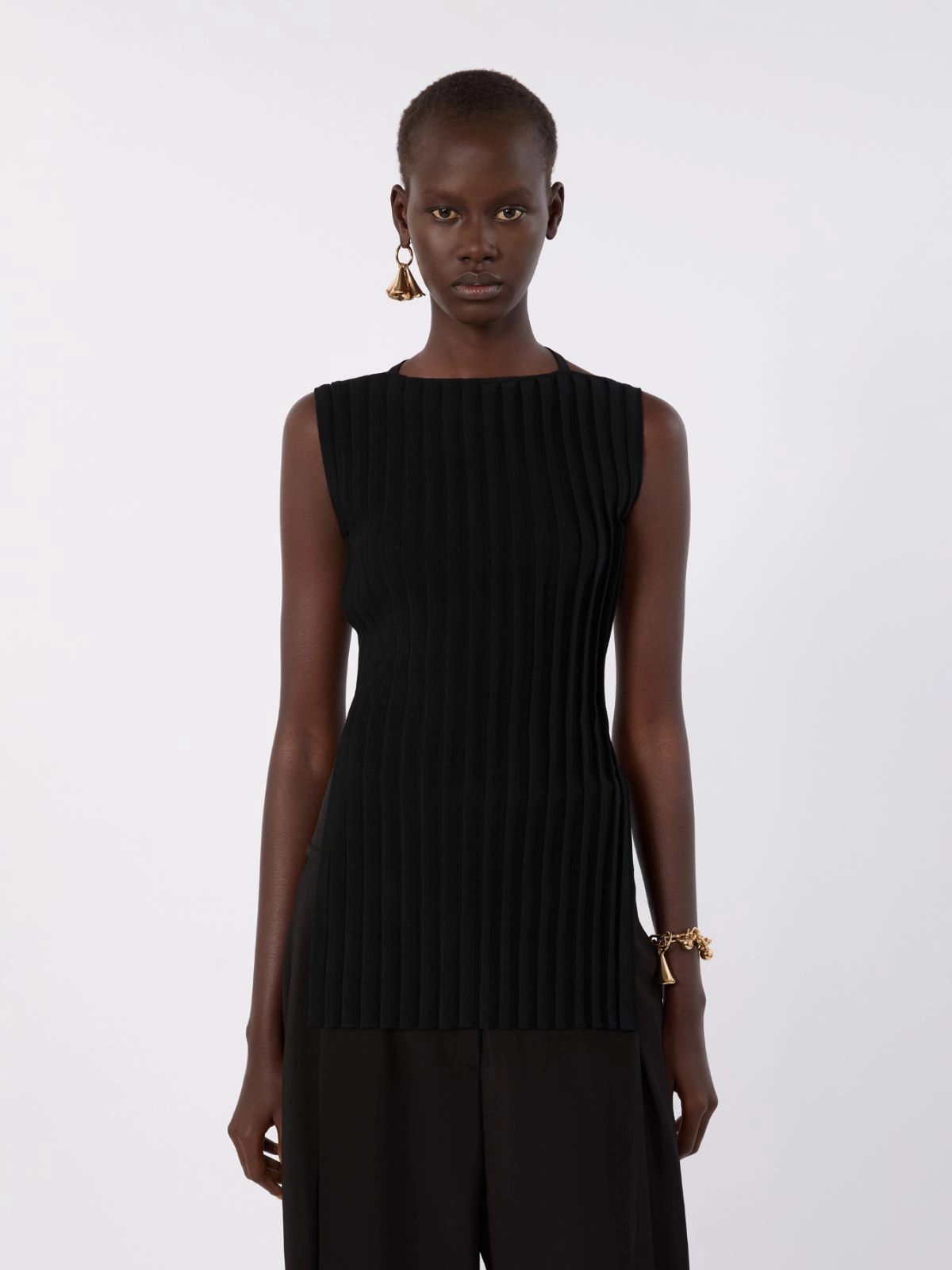 Sleeveless top featuring a sensual design, straight neckline and vertical frill-adorned front panel. The fully backless design boasts a rib-knit horizontal band at the waist.