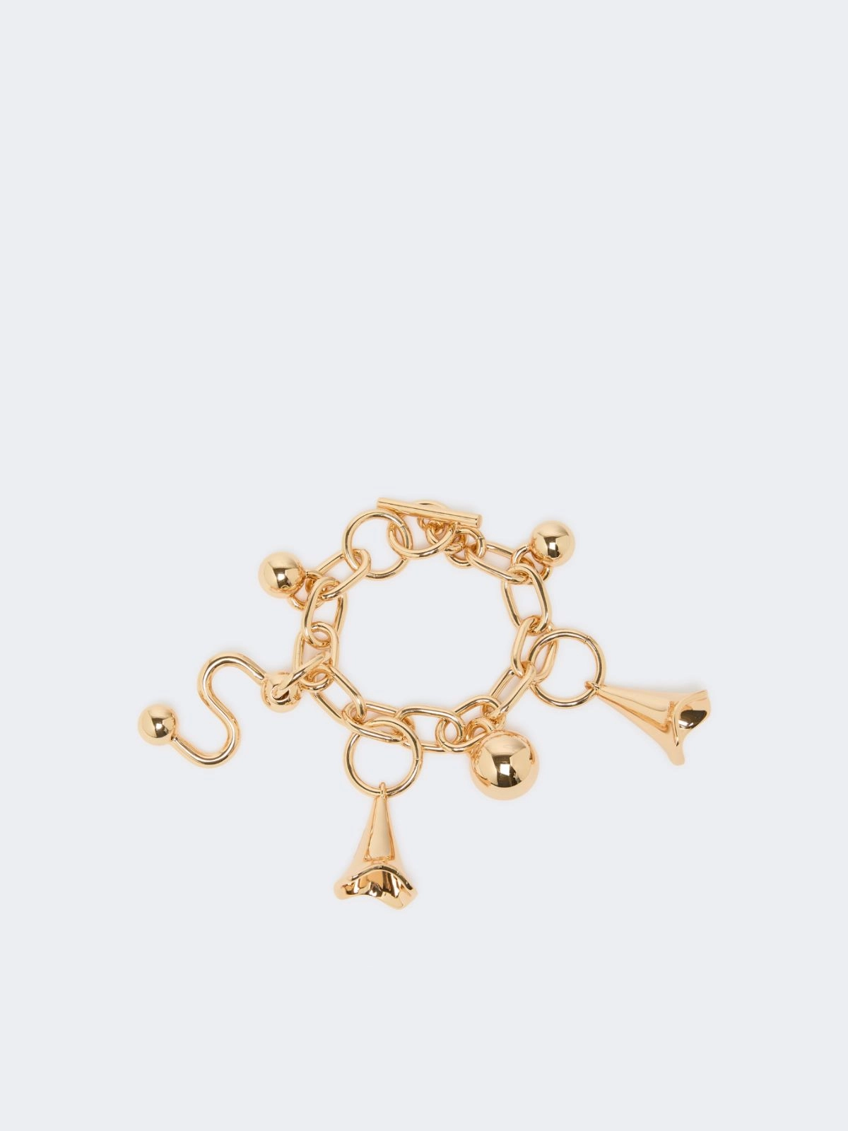 Golden metal chain bracelet, decorated with fixed charms. T-bar closure