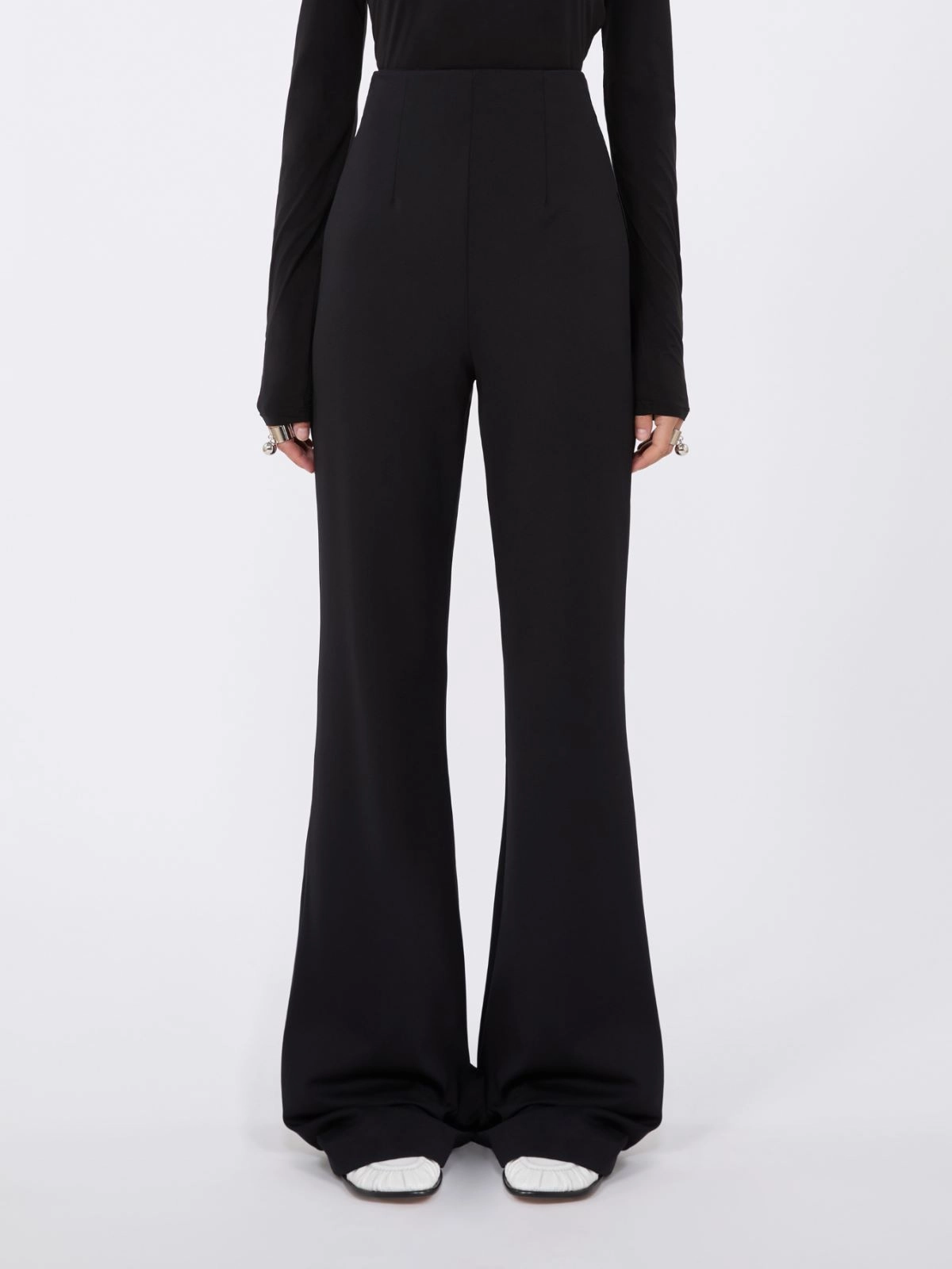 Flared trousers with a high waist emphasised by darts. The fit is tight over the hips, widening at the hem. Made of stretch jersey for perfect freedom of movement.