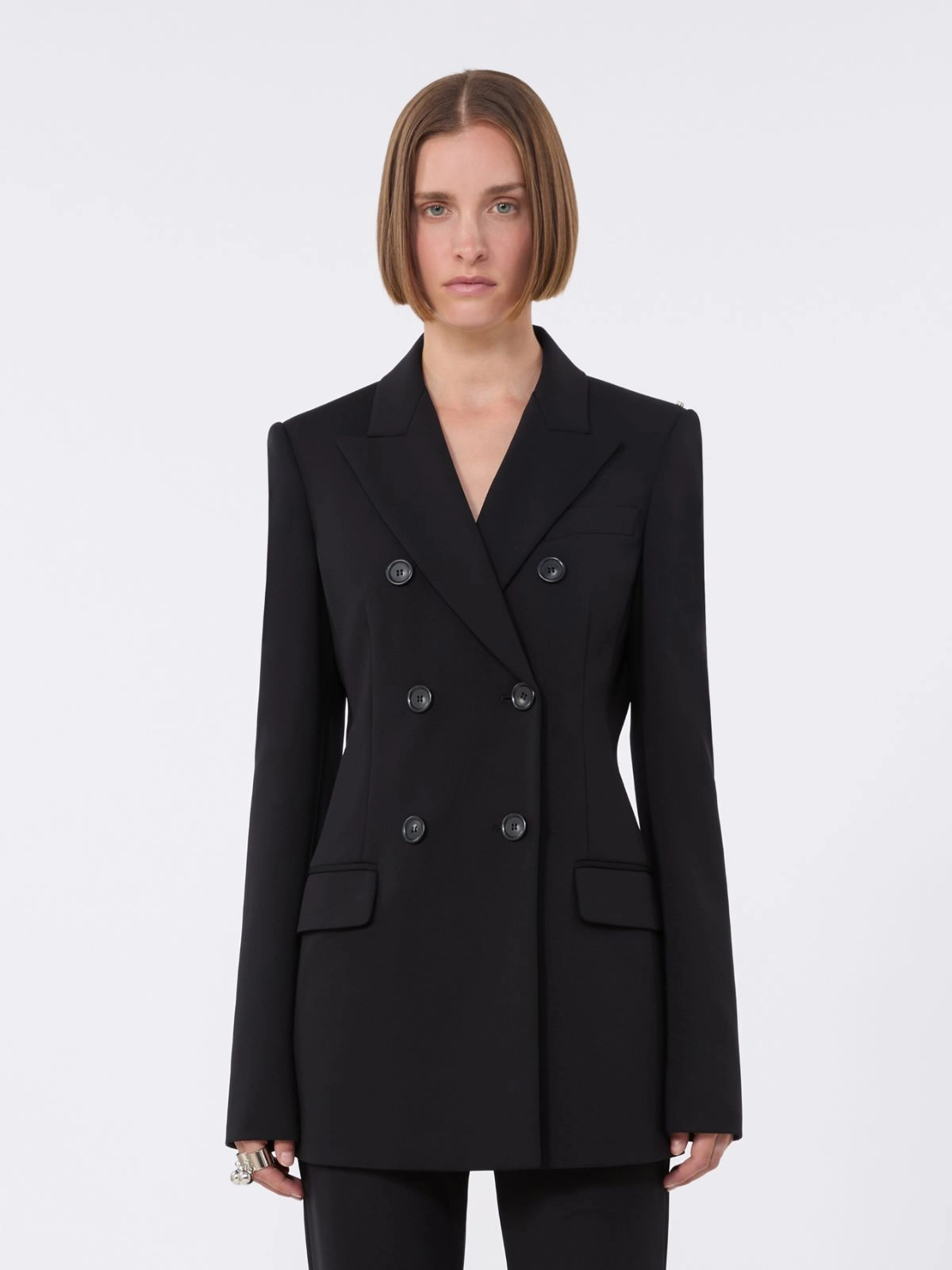 Compact jersey and a tailored cut define this new double-breasted blazer. The lines are clean, with peak lapels and contrasting colour buttons.