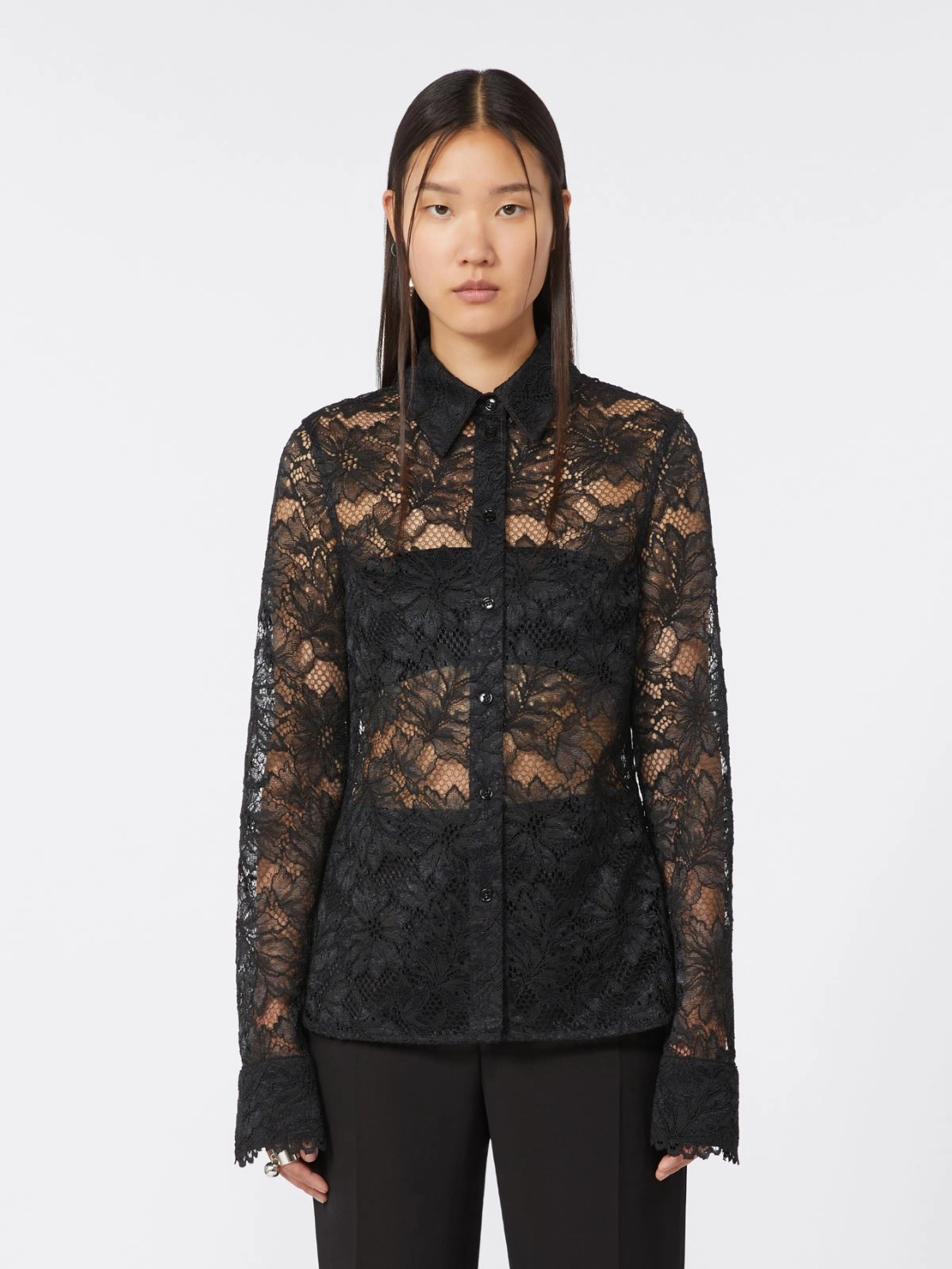 - Lace shirt with a rebrodé floral pattern
