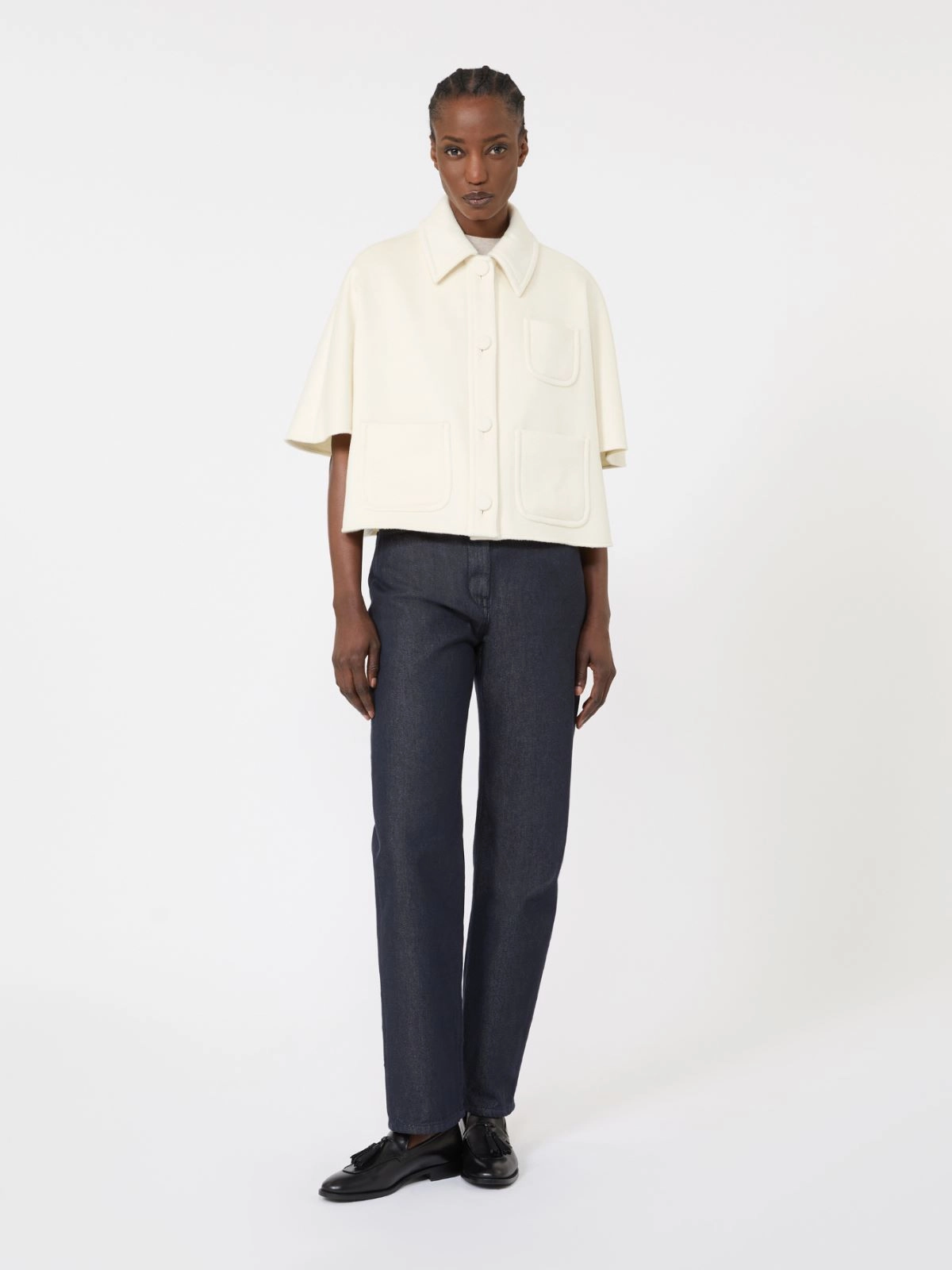 Boxy-fit short cape.
