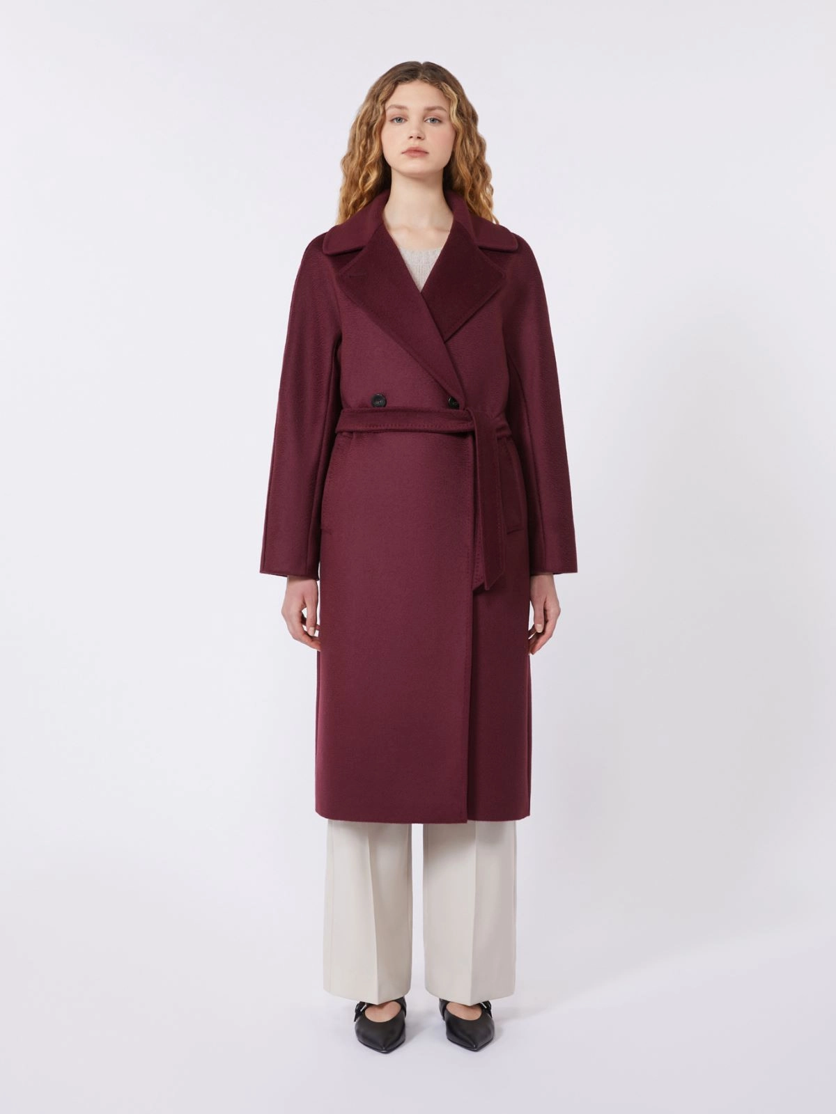 - Double-breasted fastening with buttons and matching belt at the waist