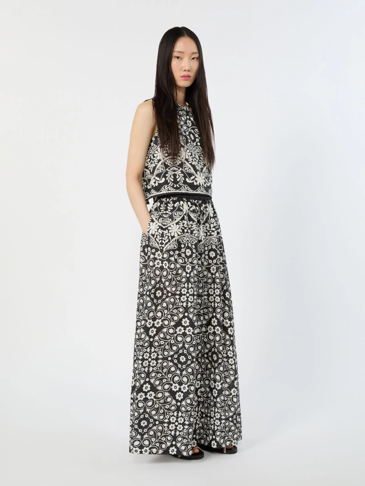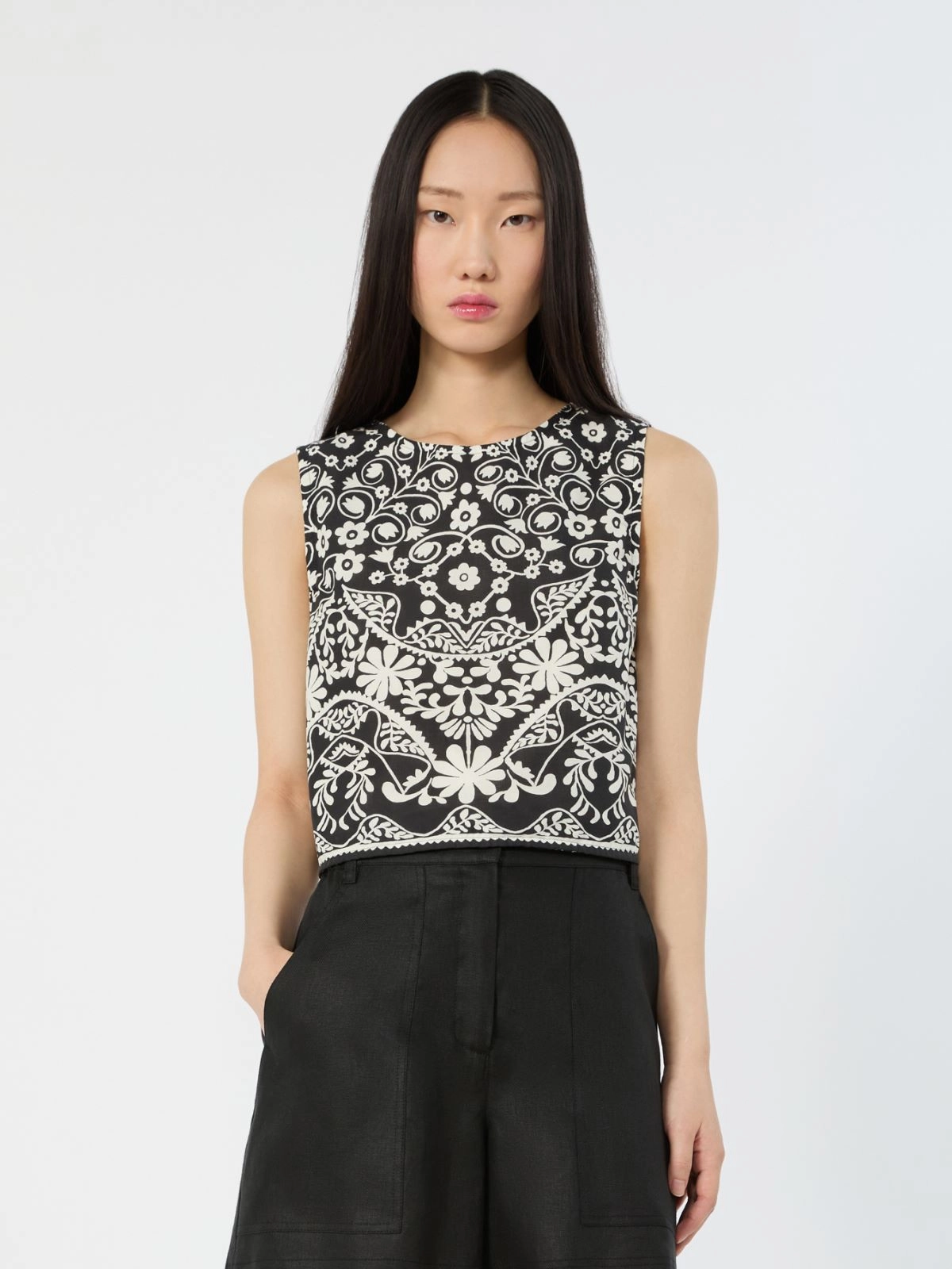 Sleeveless crop top with all-over printed collection pattern. This garment is part of the Mediterranean Ease capsule collection.