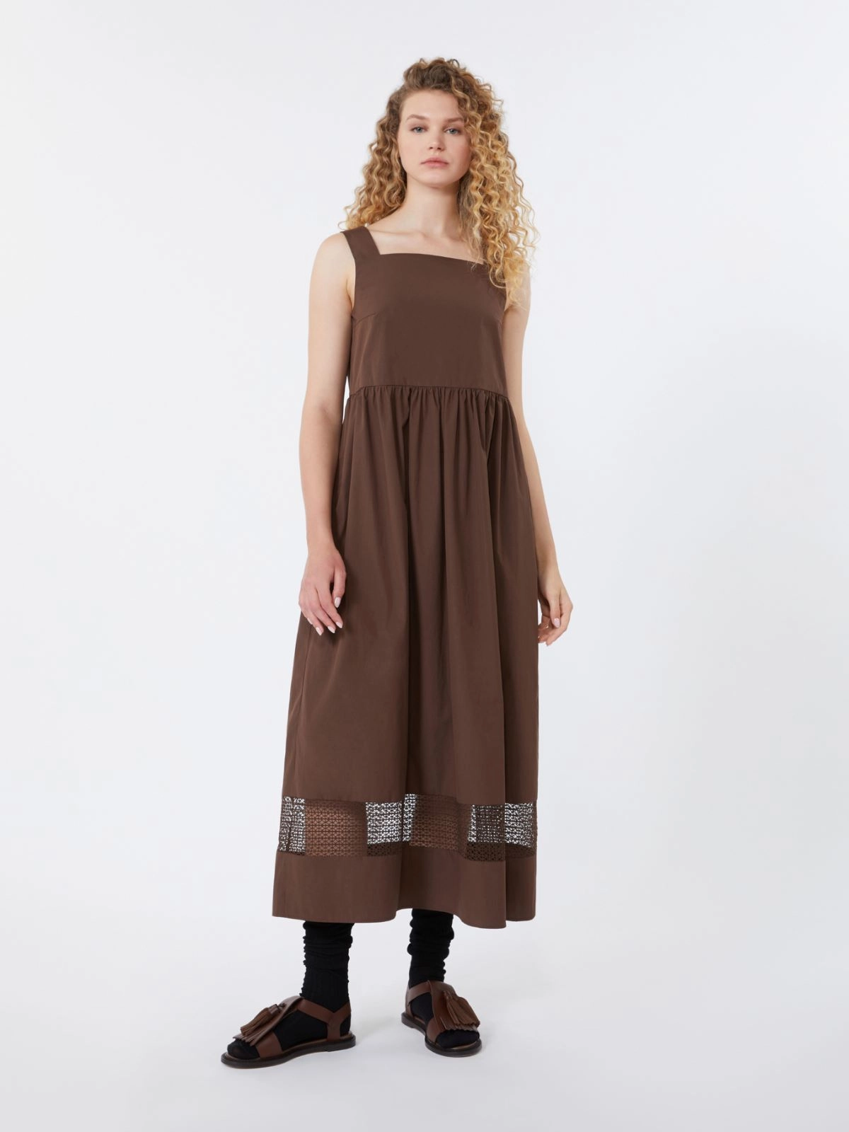 Long, sleeveless dress with a fit-and-flare silhouette and lace inserts at the hem.