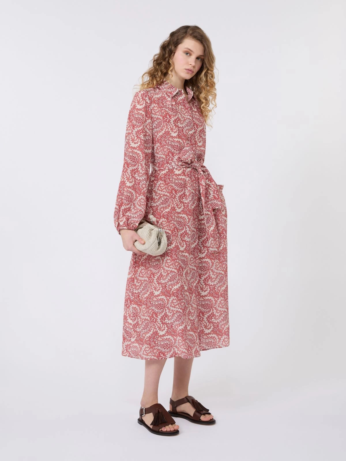 Long shirt dress with a flared silhouette and matching belt at the waist.