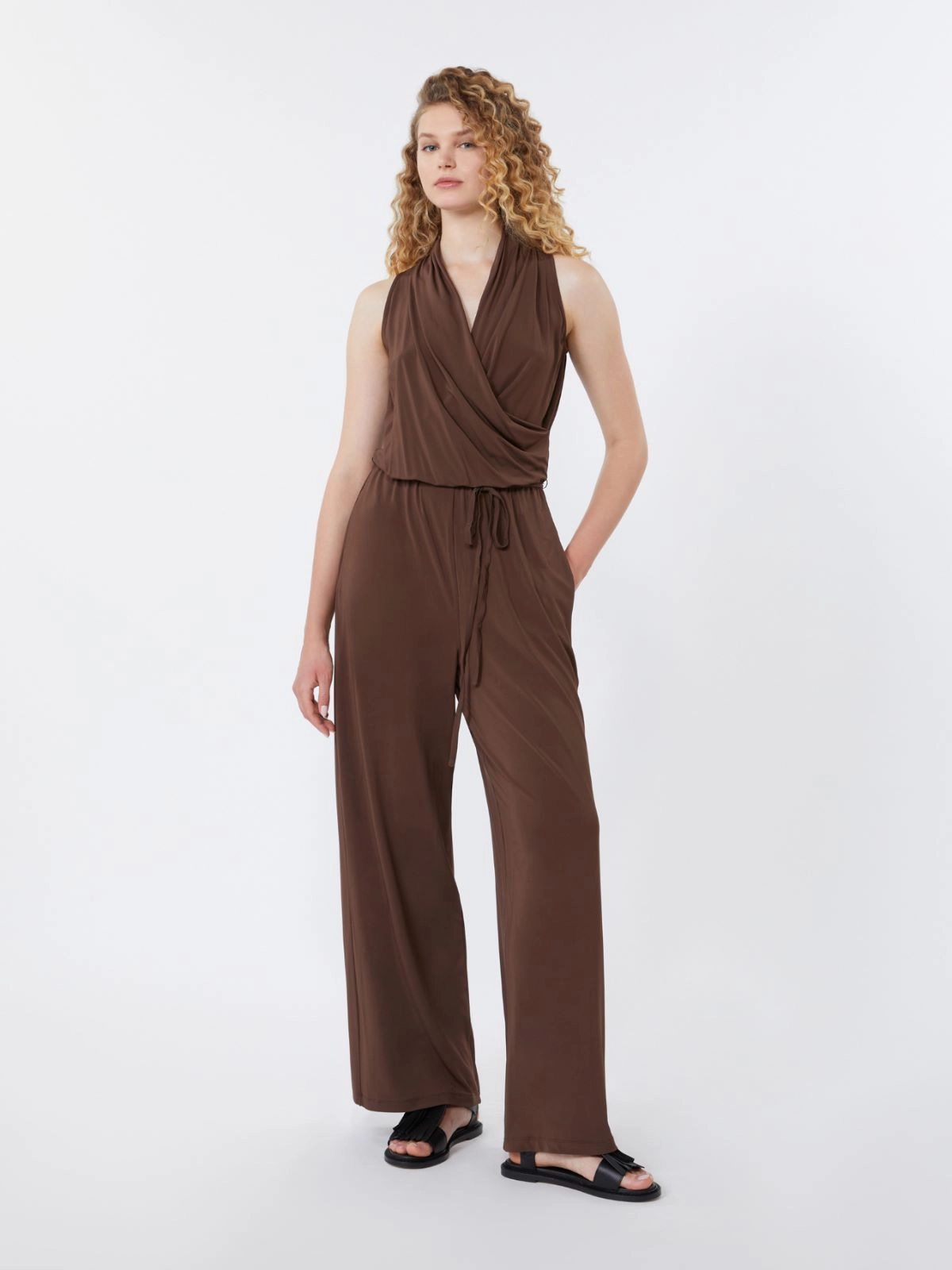 Jumpsuit with wide trousers and sleeveless bodice with a soft draped motif.