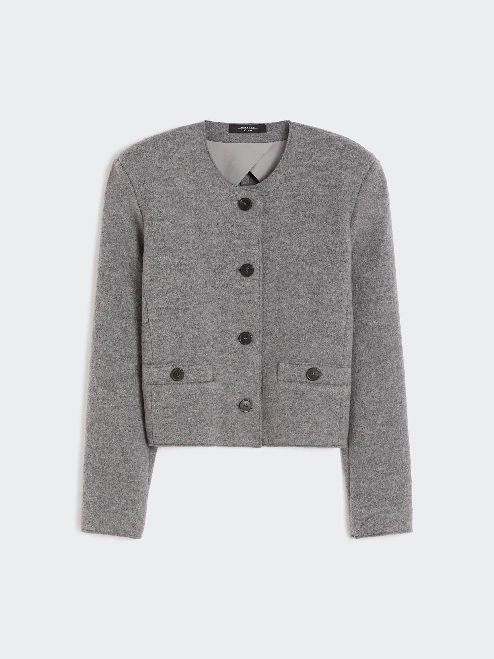 Crew-neck jacket in boiled wool jersey fabric featuring long sleeves and flap welt pockets. The garment boasts raw-cut trims and a button fastening.