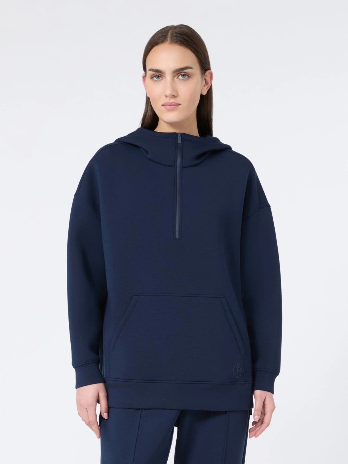 Long hoodie featuring a funnel neck which can be adjusted via the small zip on the front.
