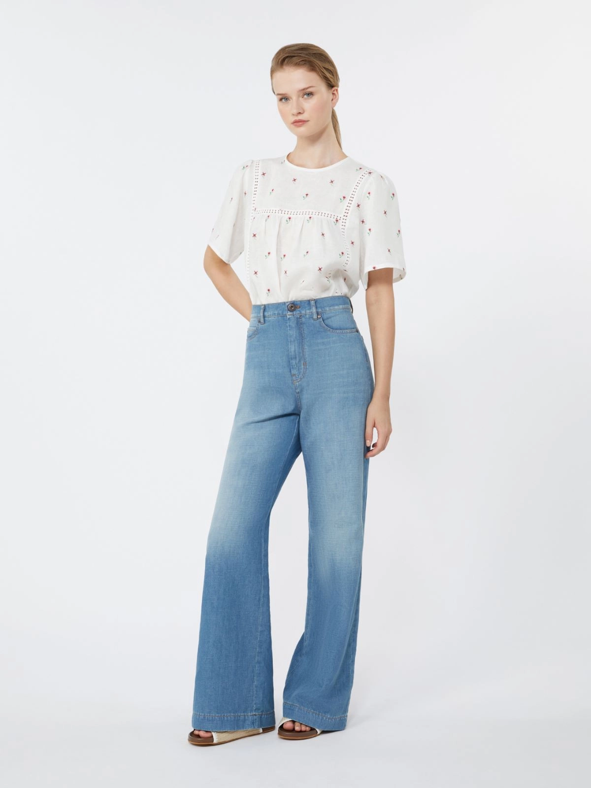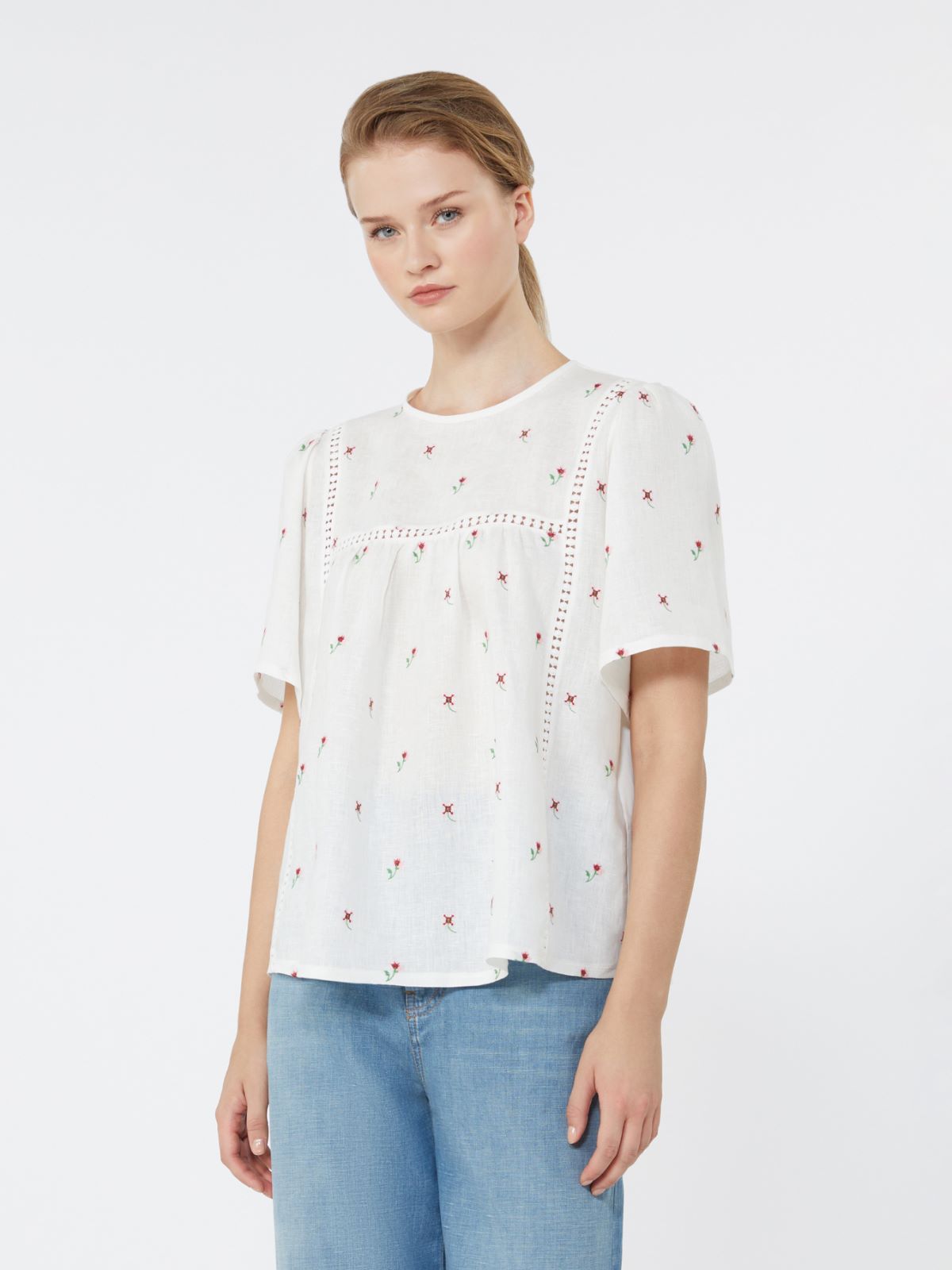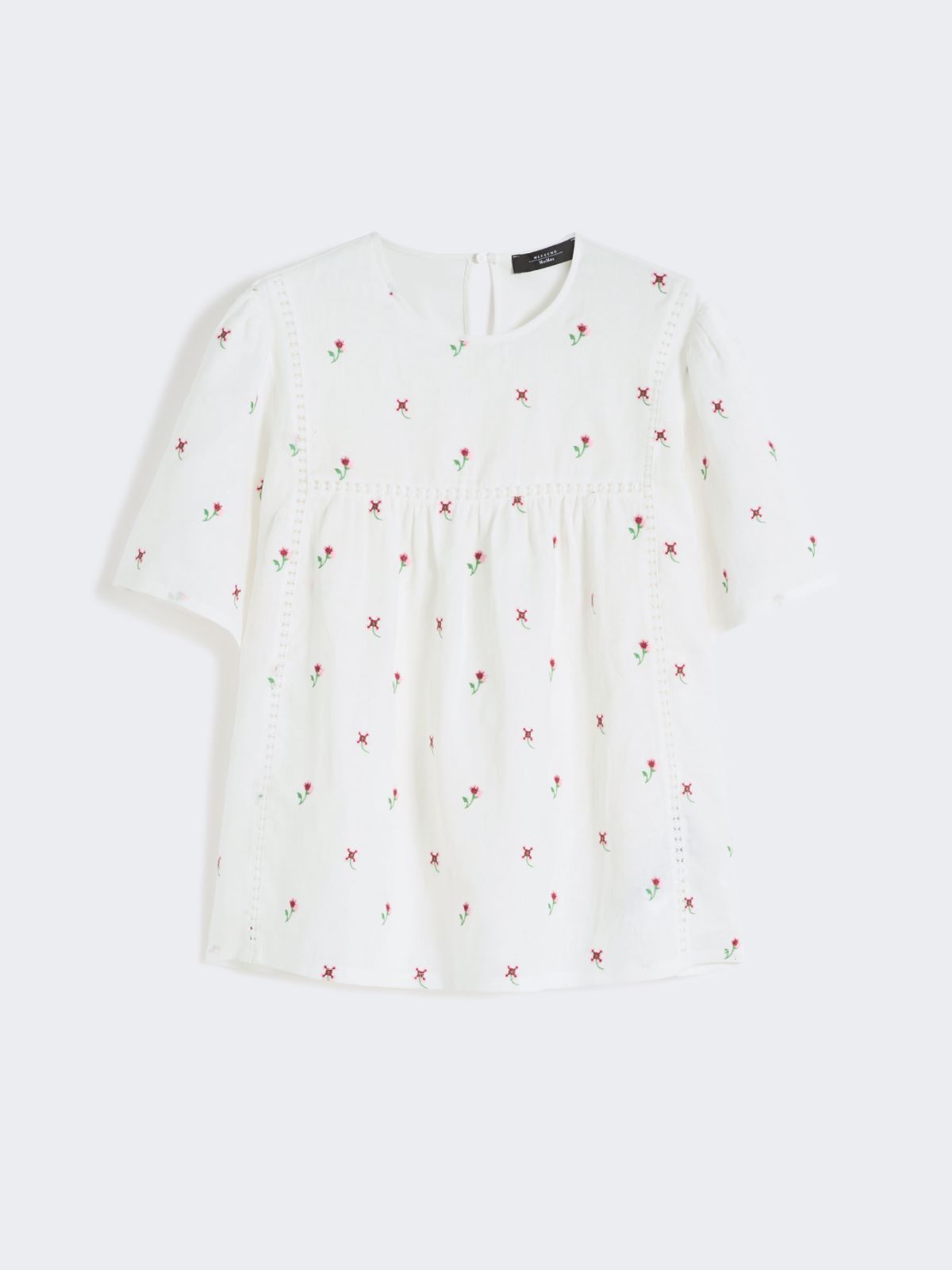 Short-sleeved top with a slightly flared line, finished with embroidery and trimming details on the front.