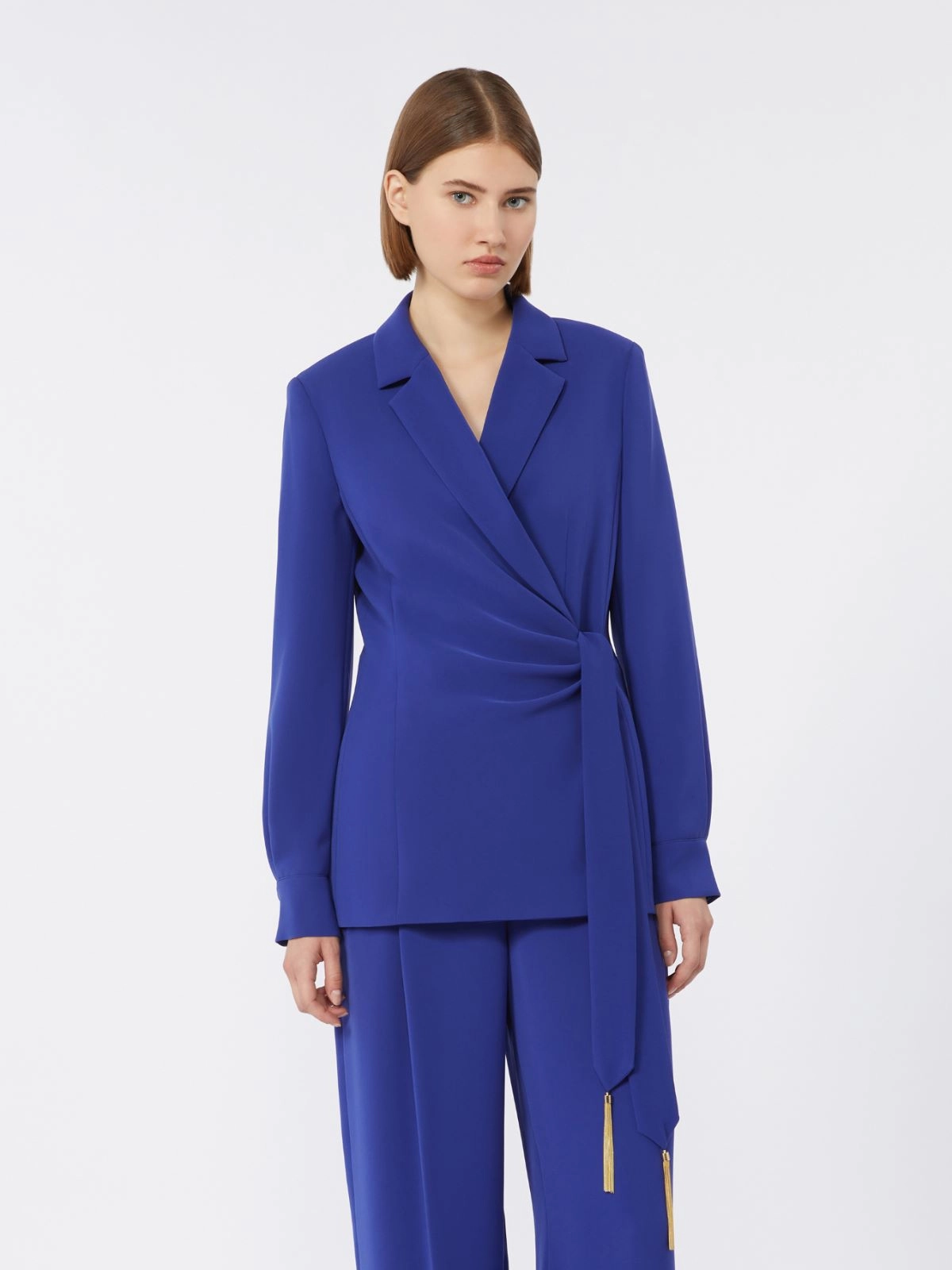 Criss-cross jacket featuring a sash and metal tassel detail.