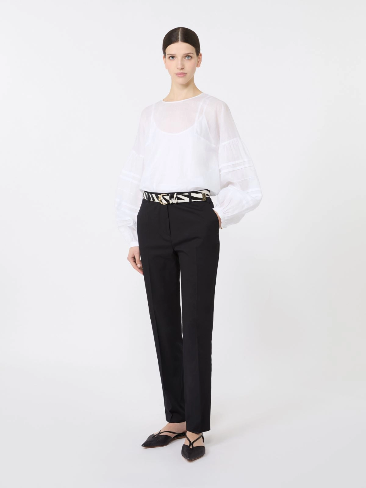 Classic trousers with a cigarette silhouette cropped above the ankle.