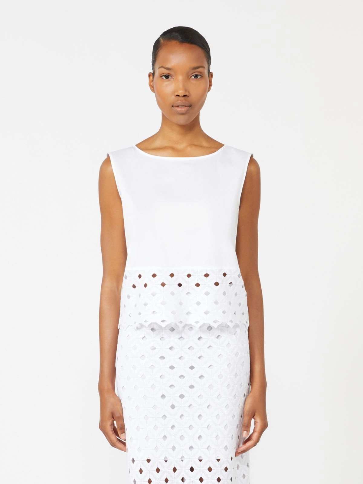 Sleeveless crop top featuring a geometric macramé lace band at the hem.