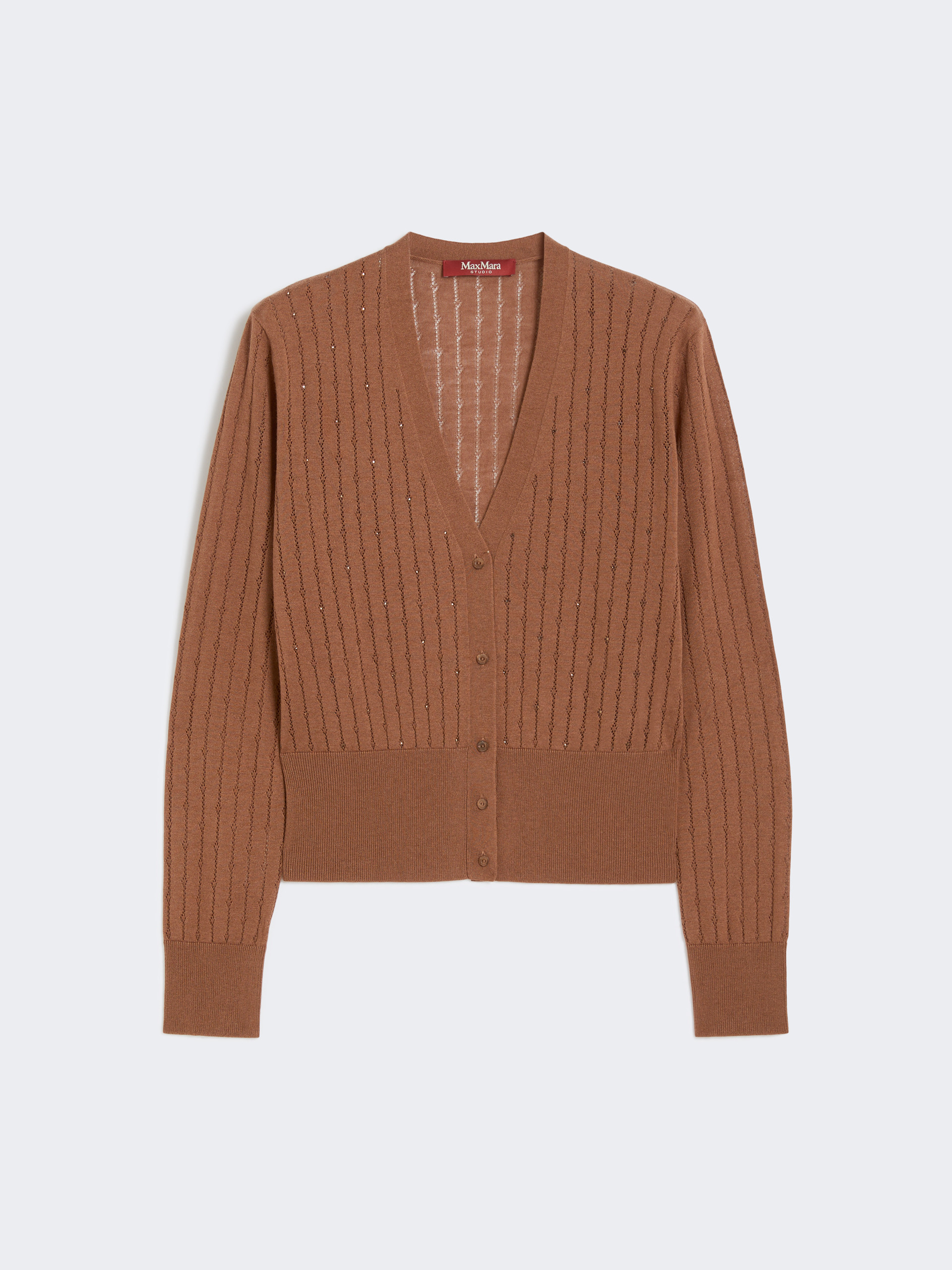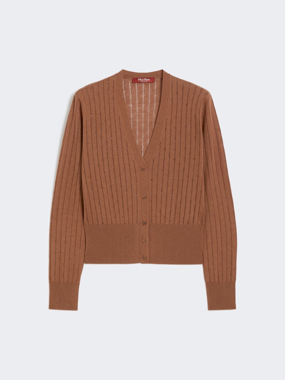 Cardigan featuring floral-patterned perforated detail and rhinestone details.