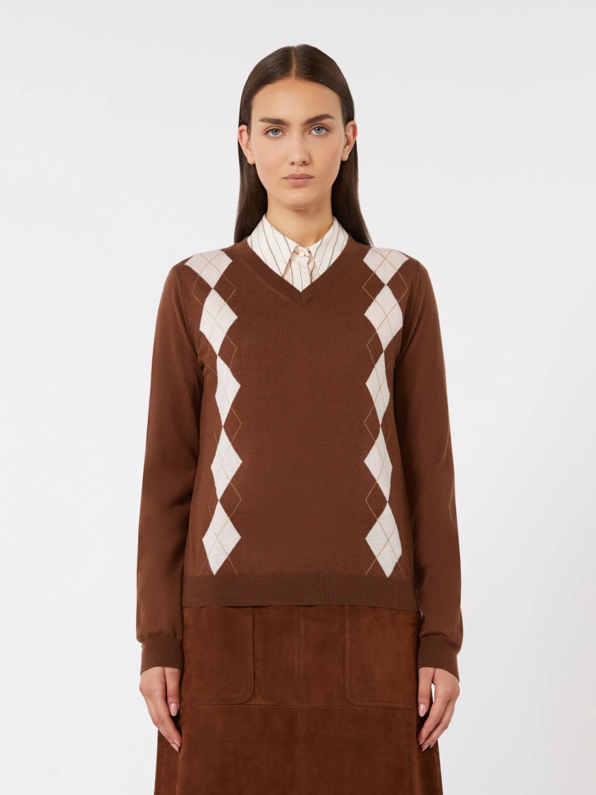Sweater decorated with an inlaid Argyle-knit pattern on the front, complete with lurex yarn.