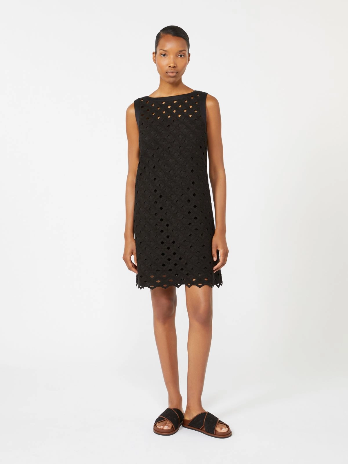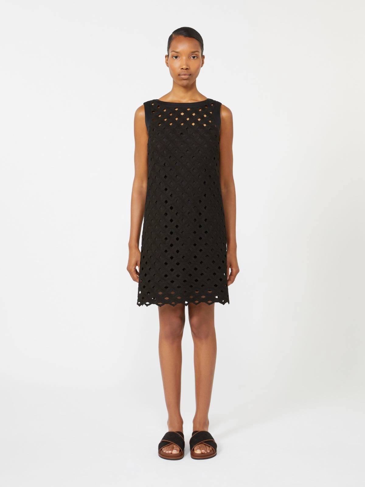 Short, sleeveless dress, fully woven with a see-through-effect geometric macramé motif.