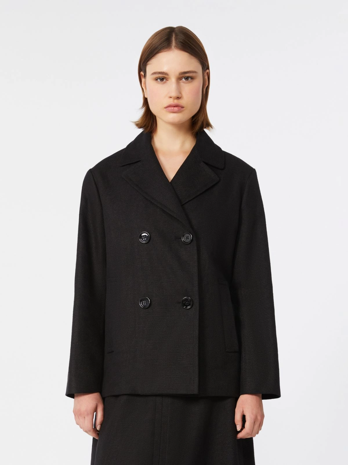 Double-breasted jacket featuring a pea coat-inspired boxy cut.