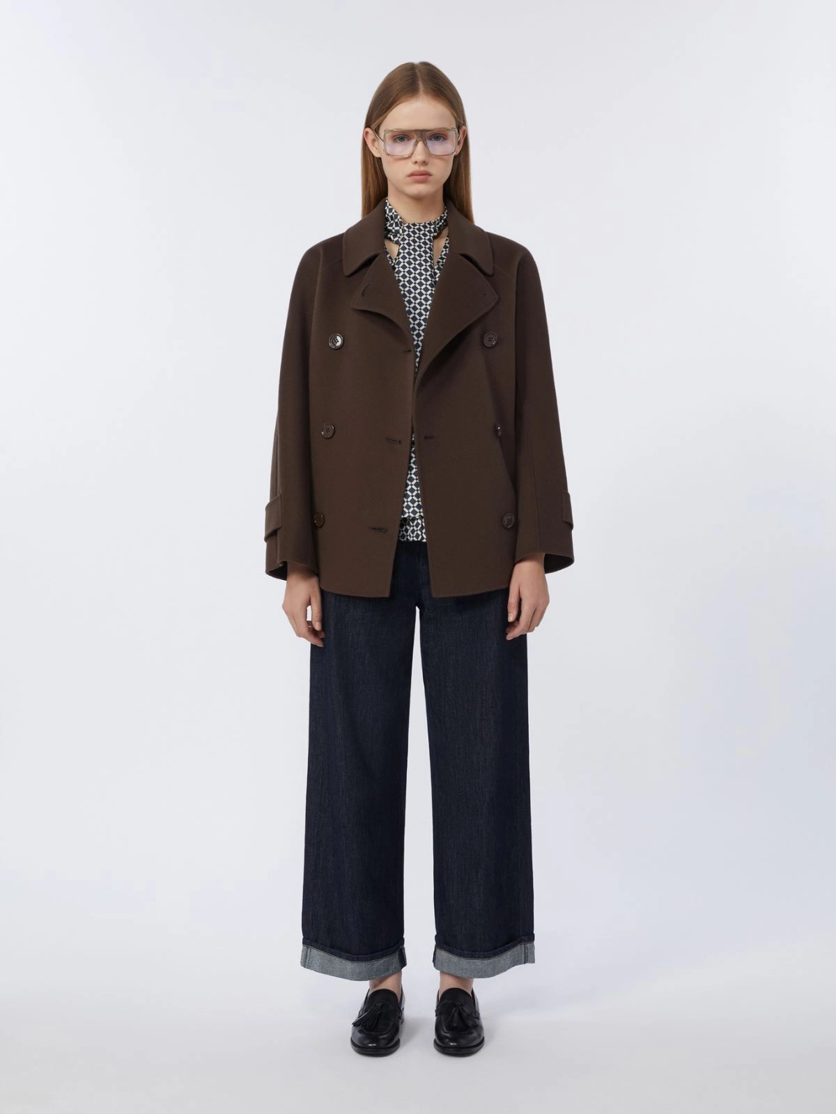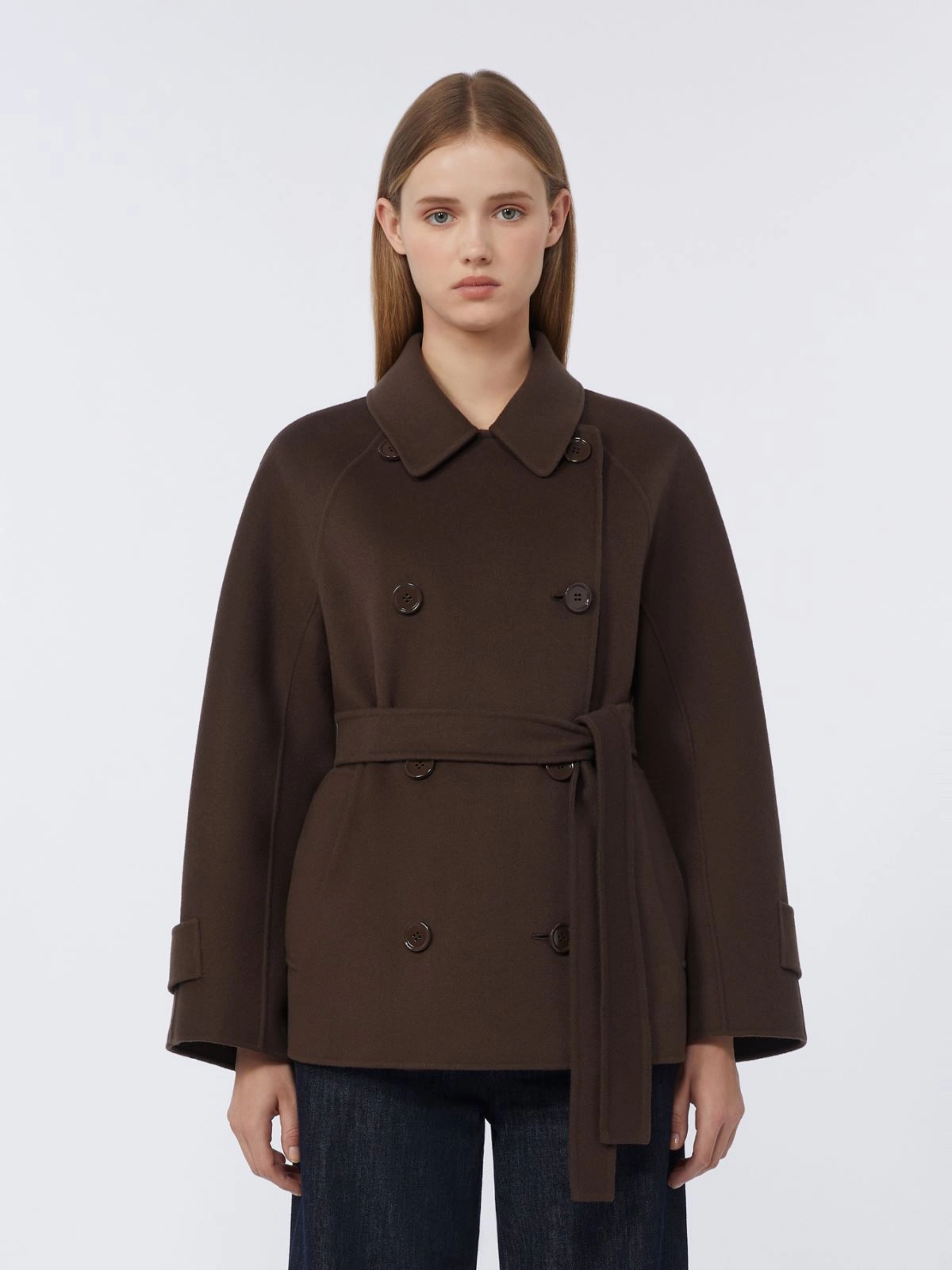 Short double-breasted coat featuring iconic trench coat-style details and a matching belt at the waist.