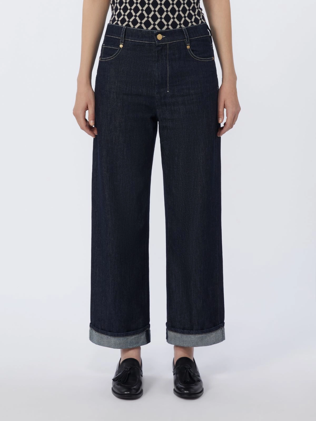5-pocket jeans with distinctive deep turn-up detail at the hem.