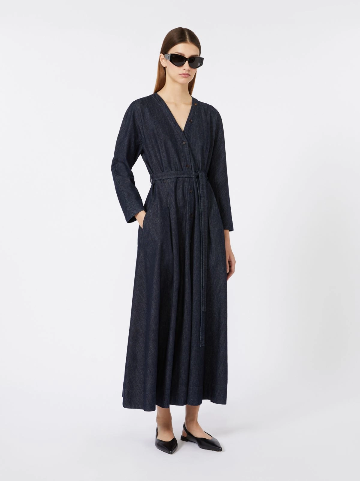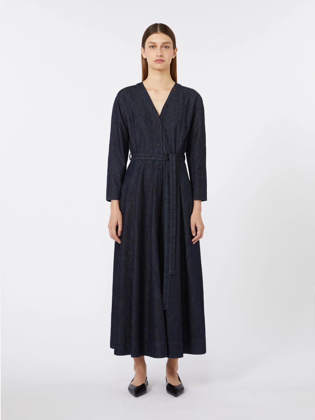 Long dress with V-neck, complete with a matching belt to accentuate the waist.